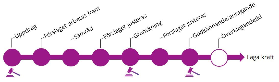 I detaljplanen ges en samlad bild av markanvändningen och hur miljön är tänkt att förändras eller bevaras. Under plansamrådet ges berörda möjlighet att lämna synpunkter på förslaget. Därefter sker en bearbetning av planförslaget som sedan ställs ut för granskning. Om synpunkter lämnas, ska dessa redovisas och berörda underrättas innan planen antas. Efter antagandet har ”ej tillgodosedda sakägare” möjlighet att överklaga detaljplanen innan den kan vinna laga kraft.