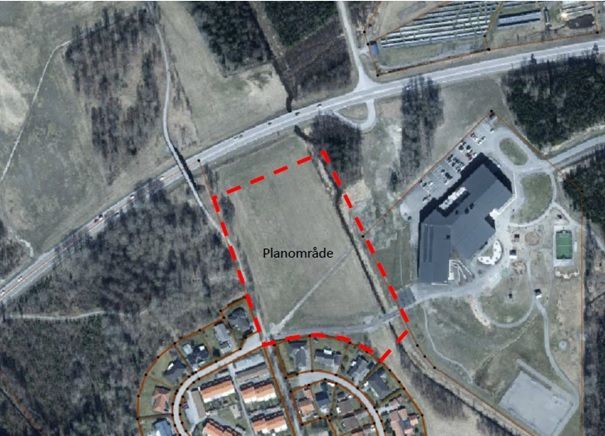 Planområdet är markerat med röd streckad linje. Bild Katrineholms kommun.