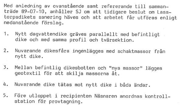 Texten ovan är ett urklipp från ”Sanering av Lasstorpsdiket och omhändertagande av kreosotförorenade sedimentmassor i Katrineholms kommun” upprättad 1989-07-14.