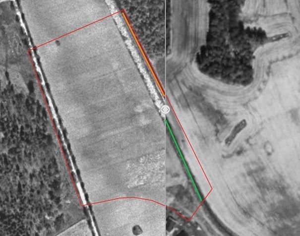 Bilden ovan visar en jämförelse mellan ortofoto från 1960 (till vänster) och ortofoto från 1997 (till höger). En linje i mitten delar bilderna. Den tidigare sträckningen av Lasstorpsdiket är markerad i orange och nuvarande sträckning från 1989 är markerad i grönt. Planområdet är markerat i rött.