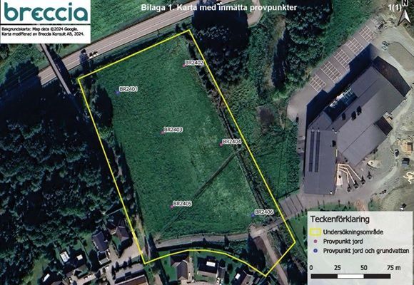 Kartan ovan visar placering av provpunkter för jord samt jord/grundvatten. Bild Breccia Konsult AB.