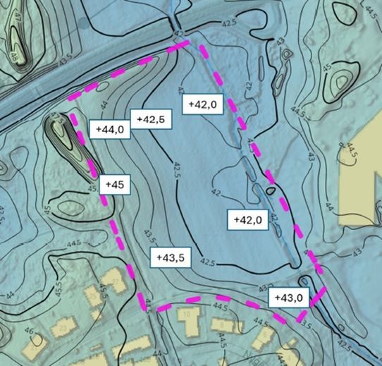 Befintliga markhöjder inom planområdet. Observera att plangränsen i norr har flyttats längre söderut. Bild Systra AB.