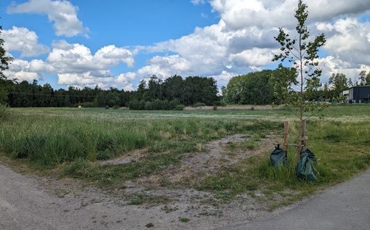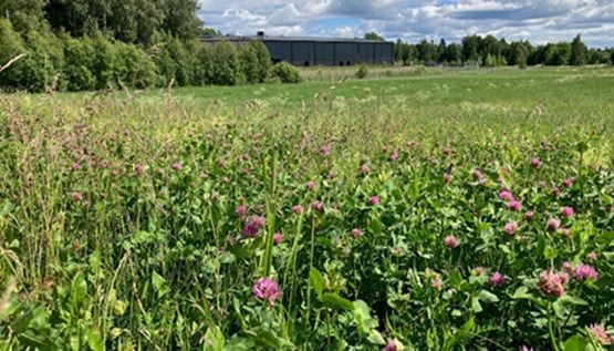 Rödklöver i planområdets norra del. I bakgrunden skymtar Stensättersskolan. Bild Katrineholms kommun.