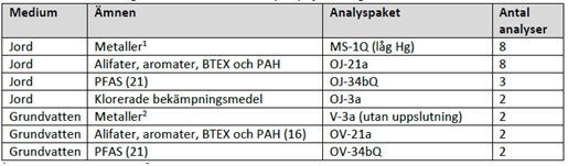 Tabellen ovan visar sammanställning av utförda analyser på jord och grundvatten. Bild Breccia Konsult AB.