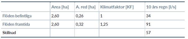 Tabellen ovan redovisar befintliga och framtida flöden efter en exploatering av planområdet. Tabell Systra AB.