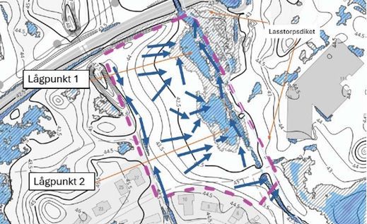 Tidigare skyfallsmodellering (DHI 2018) samt kapacitetsbedömning av Lasstorpsdiket (Sweco 2020) ligger till grund för bedömning att översvämning i Lasstorpsdiket riskerar att påverka planerad bebyggelse. Viss påverkan riskerar att ske på planerad bebyggelse som hamnar i befintliga lågpunkter, men detta kan avhjälpas genom anpassad höjdsättning av marken. Förslag är att nyttja planerat svackdike samt jobba med marknivåerna närmast Lasstorpsdiket.