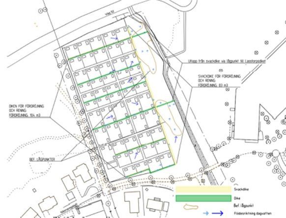 Bilden ovan visar föreslagna dagvattenlösningar. Gröna linjer redovisar en meter breda diken som leder dagvatten från kolonilotterna till ett 2 meter brett dike i den östra kanten av koloniområdet, redovisat i gult. Därifrån leds vattnet vidare till Lasstorpsdiket. Bild Systra AB.