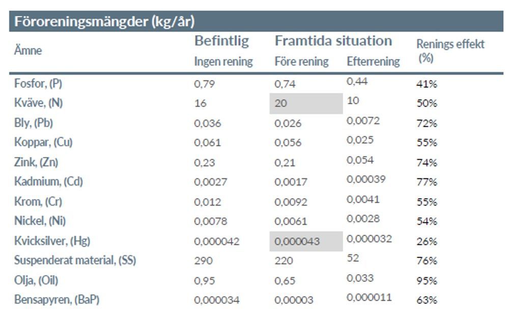 Tabellen ovan visar föroreningsmängder för befintlig och framtida situation utan rening och med rening i föreslagna dagvattenanläggningar. Gråmarkerade celler överskrider befintliga mängder. Tabell Systra AB.