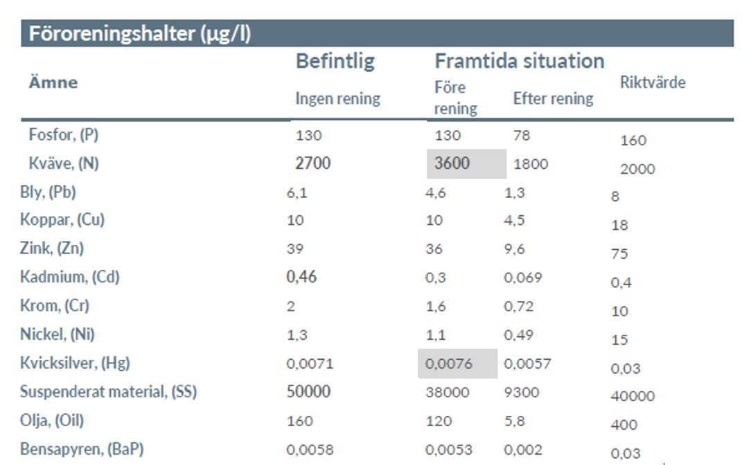 Tabellen ovan visar föroreningshalter för befintlig och framtida situation utan rening och med rening i föreslagna dagvattenanläggningar. Fetmarkerade celler visar halter som överskrider tillämpade riktvärden i utsläppspunkt. Gråmarkerade celler överskrider befintliga halter. Tabell Systra AB.
