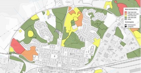 Kartan ovan visar en översiktlig naturvärdeskartering för Katrineholms tätort. Rosa = Högt naturvärde, Orange = påtagligt naturvärde, Gult = visst naturvärde, Grönt = lågt naturvärde, Grått = Okänt naturvärde